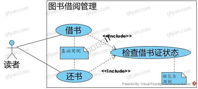 图 1展示了一个使用包含用例的例子,对于读者到图书馆“借书”和“还书”这两个用例,它们都包含了“检查借书证状态”这个用例。无论读者借书还是还书,系统都将检查借书证的状态,例如借书证的有效期等。如果不执行“检查借书证状态”这个用例,则“借书”和“还书”两个用例都将无法完成,“检查借书证状态”这个被包含用例是“借书”和“还书”两个基本用例的不可缺少的组成部分。