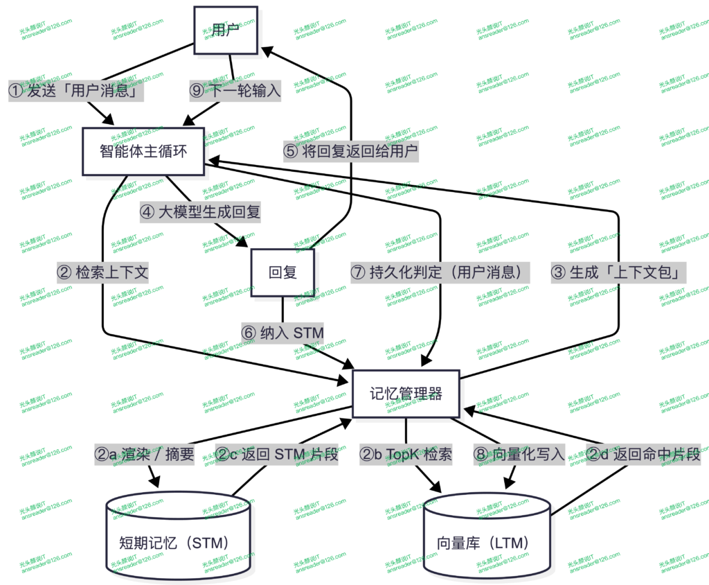 智能体使用短期记忆与长期记忆的方式则是在回答问题前,先以“当前问题 + STM摘要”对LTM做相似检索,再把Top-K命中片段与“当前问题 + STM 摘要 + 最近对话原文”一并注入提示词。其完整数据流如图 2所示。