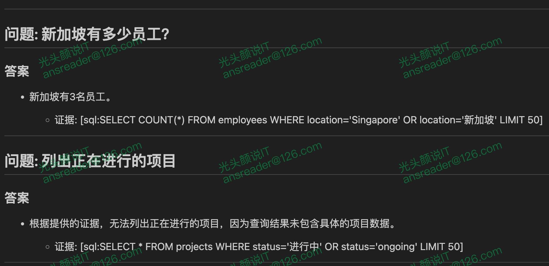 - 纯 SQL:答案本质上是“表里的事实”,例如“新加坡有多少员工”“列出正在进行的项目”。