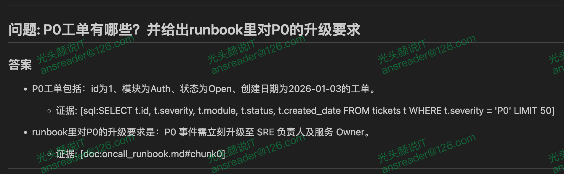 - MIX(SQL + RAG):同一问题同时需要事实与规则,例如“P0 工单有哪些?并给出 Runbook 里对 P0 的升级要求”。只用 SQL 会缺少规范依据,只用 RAG 会缺少当前事实。